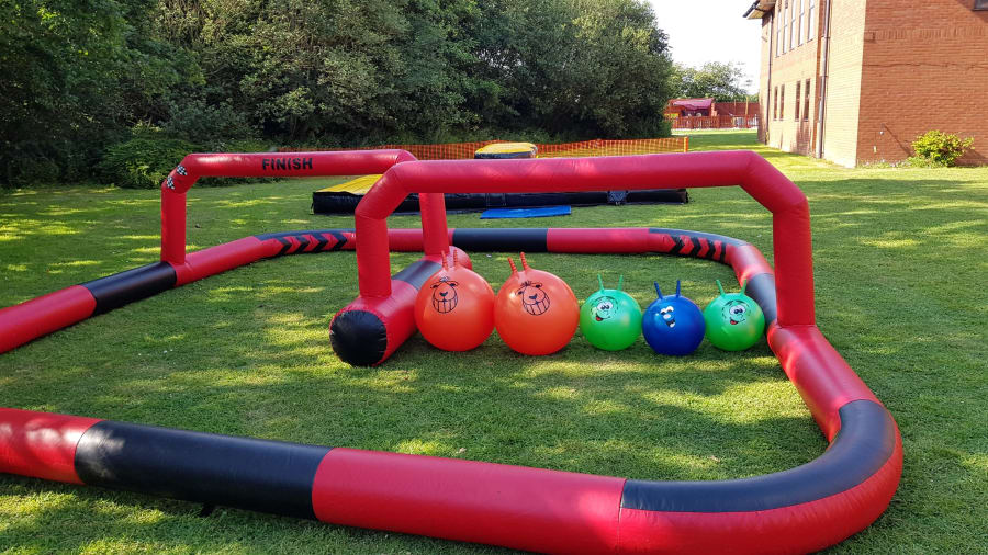 This track is supplied with 3 x adults and 3 x childrens sized space hoppers so participants can race each other around the track and try to be the first racer to cross the finish line!