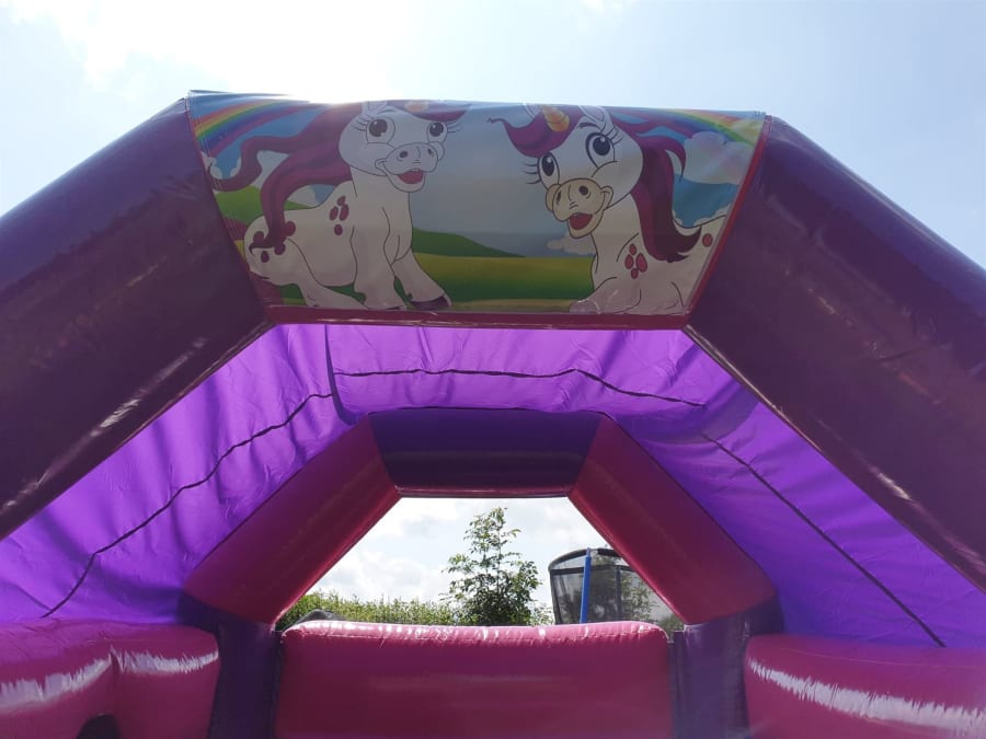 Unicorn bouncy castle with slide combi. This inflatable is great fun for children up to 12 and is very popular with the younger Kids