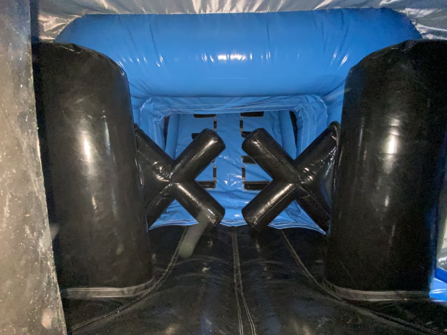 • Master inflatable X-shaped bish bash obstacles before ascending steps ⛷️