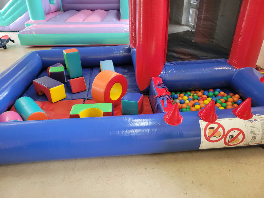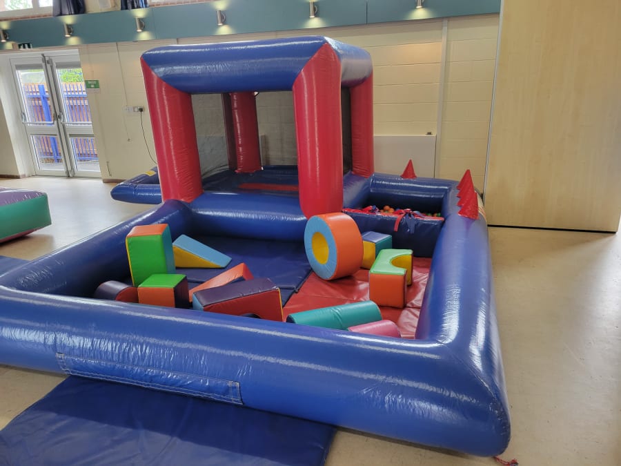 Our soft play surround comes complete with soft play shapes, small bouncy castle 5ft x 5ft, ball pool, Air Juggler Cones, Safety Mats, Fitted Ground sheet, safety mats.