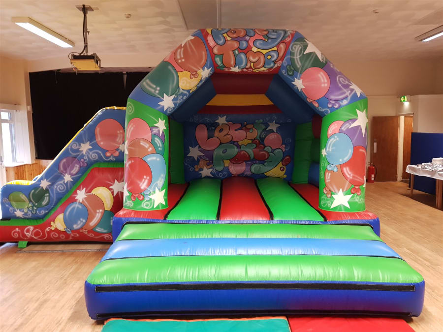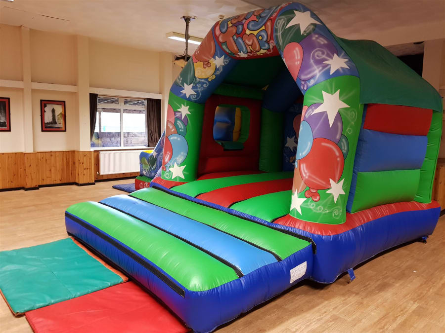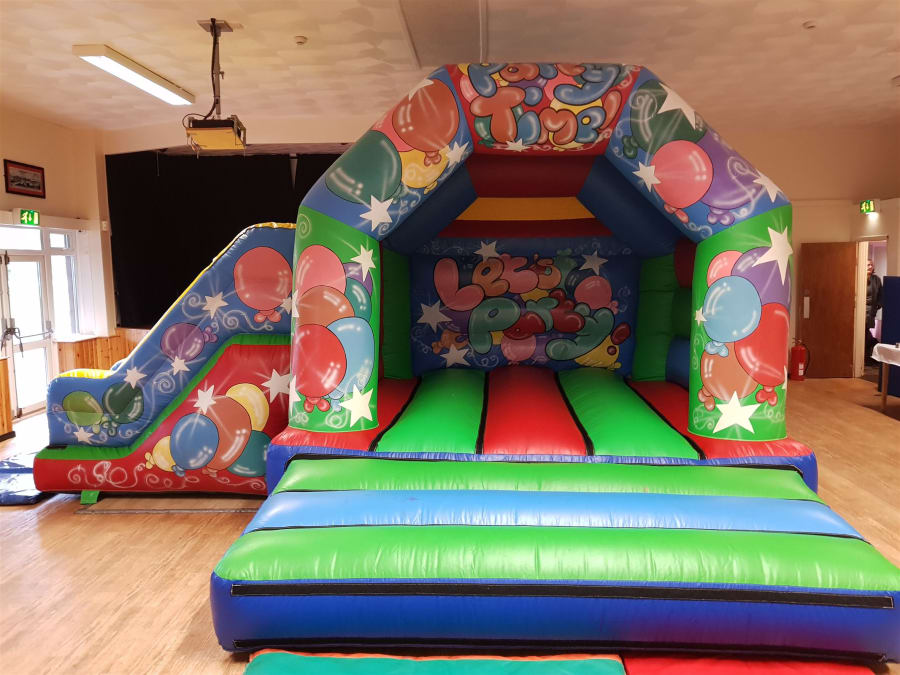 Party time bouncy castle with slide combi. This inflatable is great fun for children up to 13 and is very popular with the younger Kids