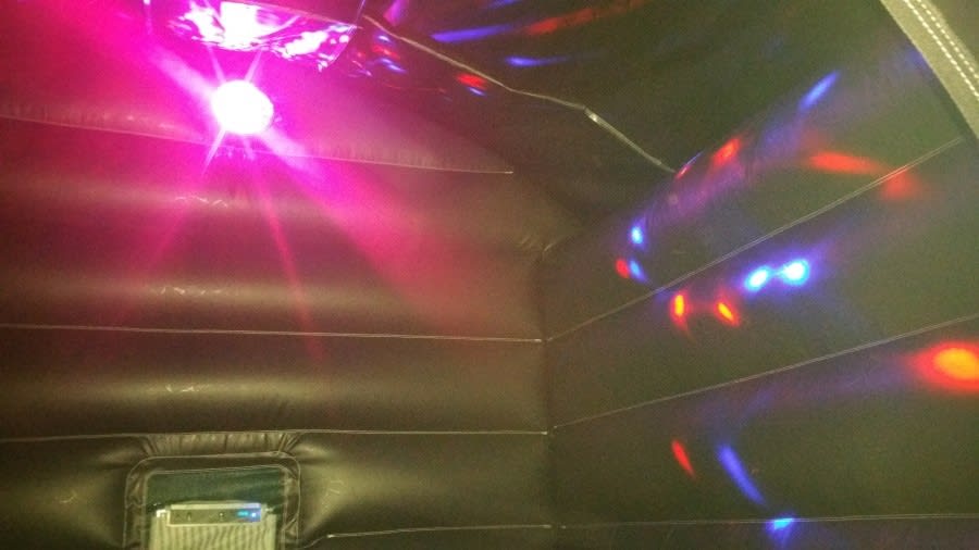 The mini Disco Dome bouncy castle is fully enclosed and includes a sound system and disco lighting. The speaker has blue tooth so any device with music can be connected so you can use your own device ie iphone, android systems etc