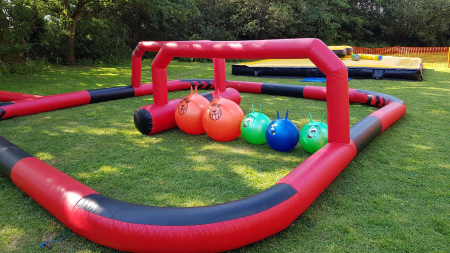 This track is supplied with 3 x adults and 3 x childrens sized space hoppers so participants can race each other around the track and try to be the first racer to cross the finish line!