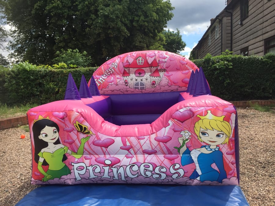 Our Princess Inflatable ball pool with AIr Jugglers will keep the little ones happy with 6 air jugglers that make balls float in mid-air which they will love. It has low inflatable sides and a built in mat underneath to ensure stable standing for children. This ball pit also has an access entrance gap which allows easy entrance and exit for little ones.